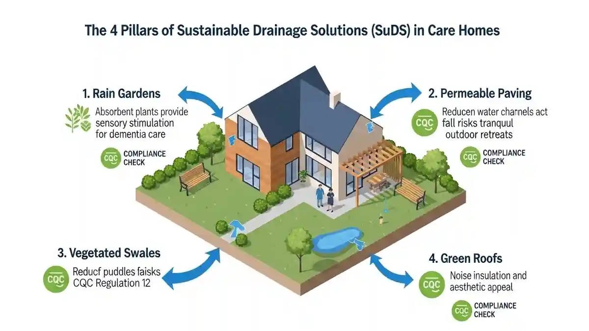 The future of sustainable drainage solutions CQC care home design is the integration of SuDS (Sustainable Drainage Systems). In Abingdon, Policy EN18 of the Local Plan encourages SuDS to manage surface water runoff, which often plagues the surrounding area.